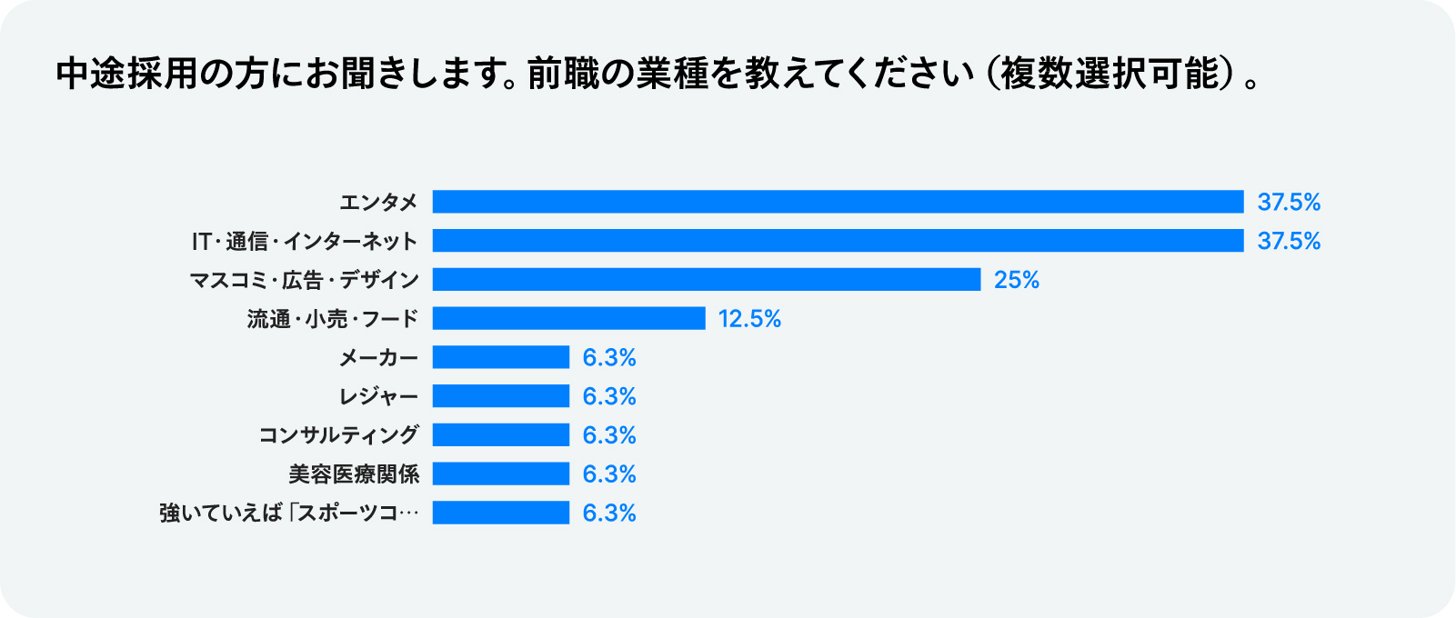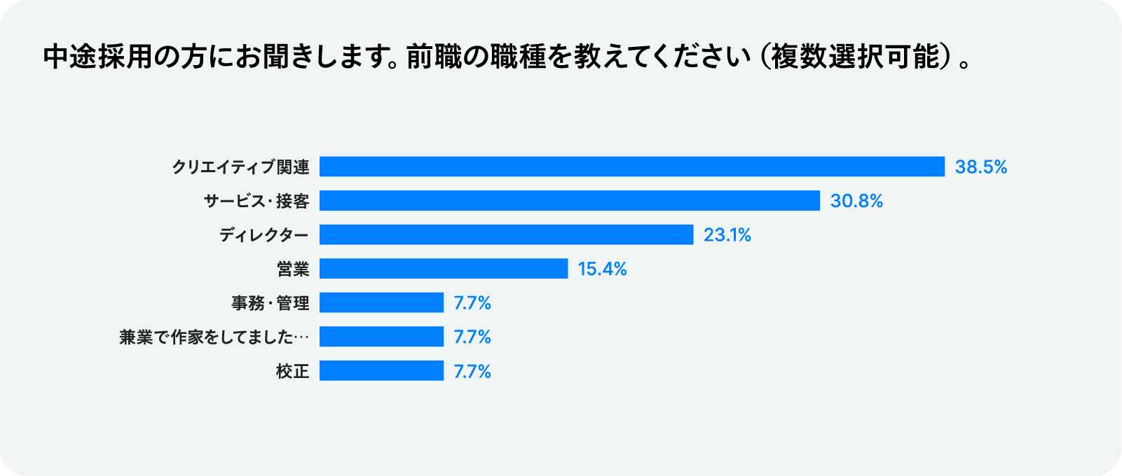 先の質問にある学生時代の学部に関してはややばらつきがありましたが、中途採用の前職の業種に関しては、ややWebtoonと相関がありそうなエンタメやIT通信業界の出身者の割合が多いという結果が出ました。