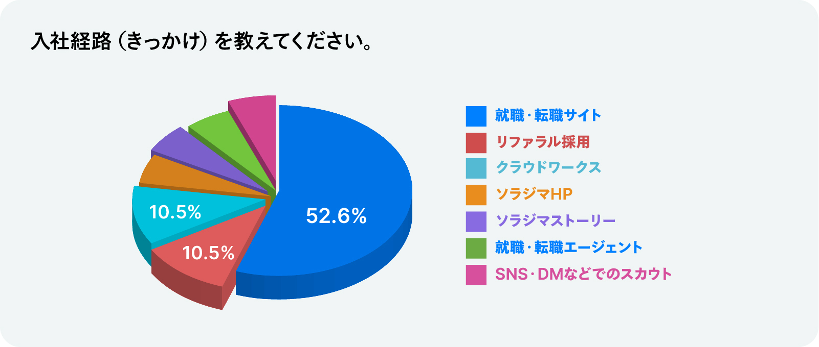 一方で、入社の経路が多様なことはソラジマの特徴の一つかもしれません。ソラジマストーリーやソラジマTVを見たことによる直接応募や、SNSのDMからスカウトを受けての応募など、入社の経緯が人によって大きく違う場合があるのです。