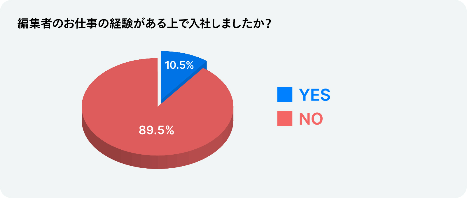 しかし、編集者経験がある上での入社はなんとたった10%ほど。中途採用であっても、ほとんどの編集者は同じスタートラインから編集者の仕事を始めているのです。