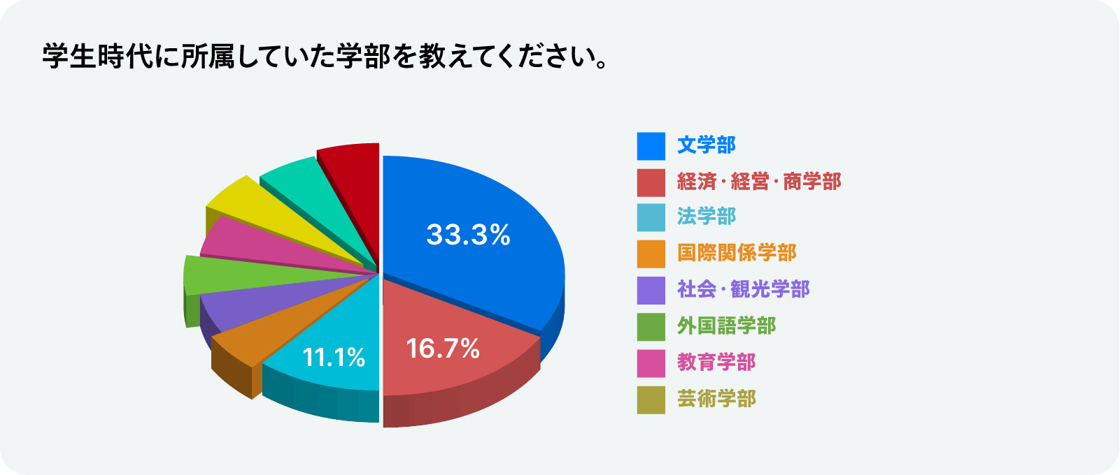 ソラジマ編集者が学生時代に所属していた学部は、上から文学部、経済・経営商学部、法学部が多いという結果が出ました。