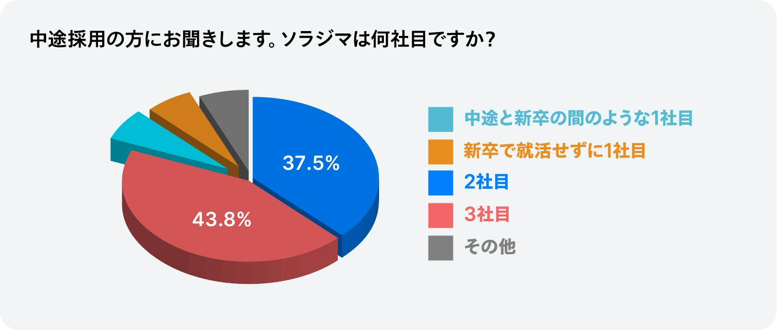 ソラジマの編集者は中途採用での入社が80%以上と、新卒採用に比べて圧倒的に多い傾向にあります。