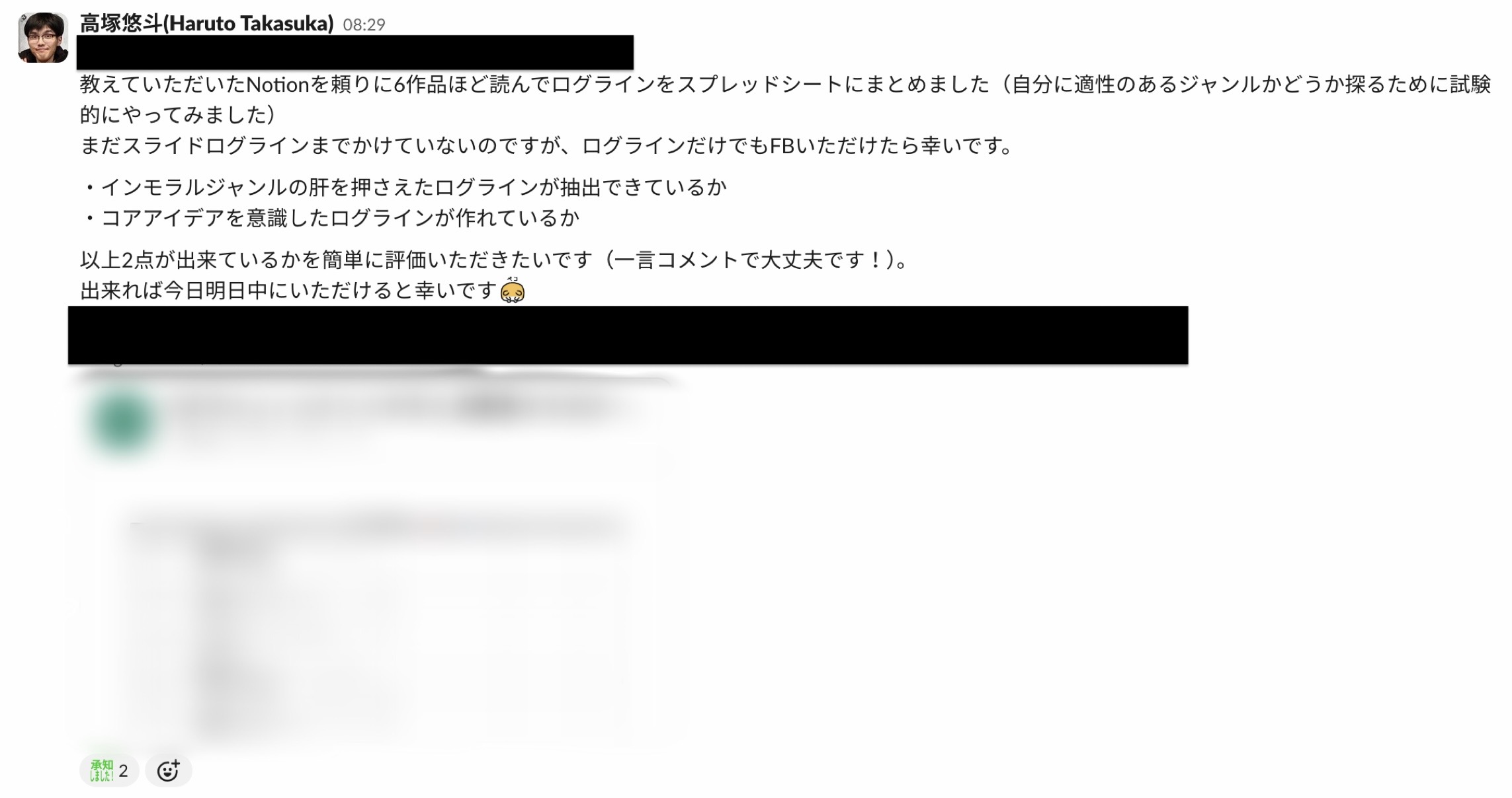 高塚:僕は入社当初、Slackにインプット用として読んだ漫画の感想やログラインを投稿し、「よかったらフィードバックください」と先輩たちにお願いしてみたんです。