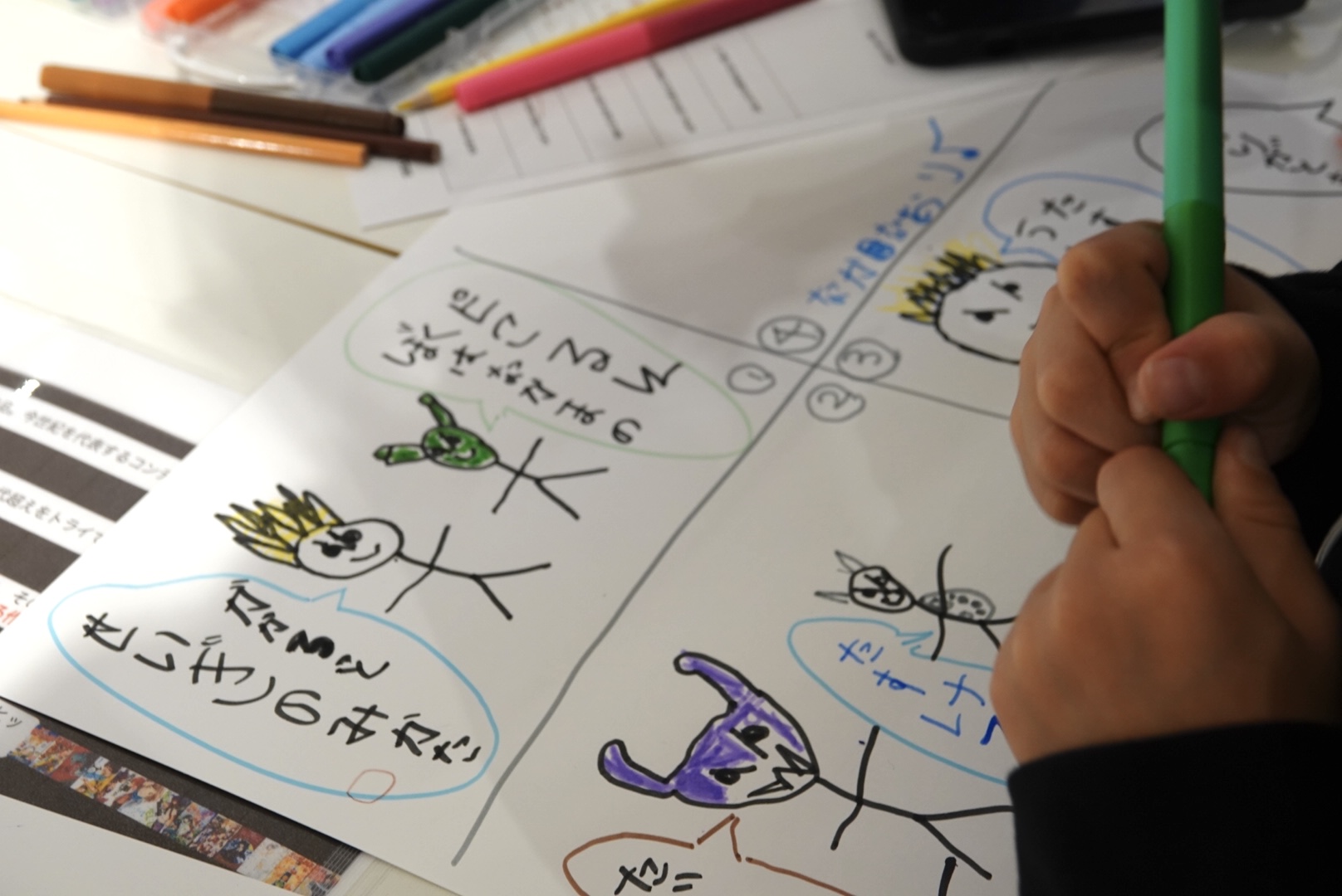 企画書づくりに入ると、皆するすると画用紙に思い思いのストーリーを描いていきます。