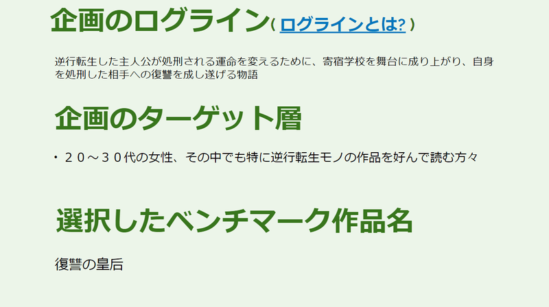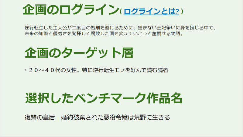 ・強いて言うならば、あまりにベンチマーク通りなので、何かこの企画ならではのオリジナリティがあると企画書は通ると思う。