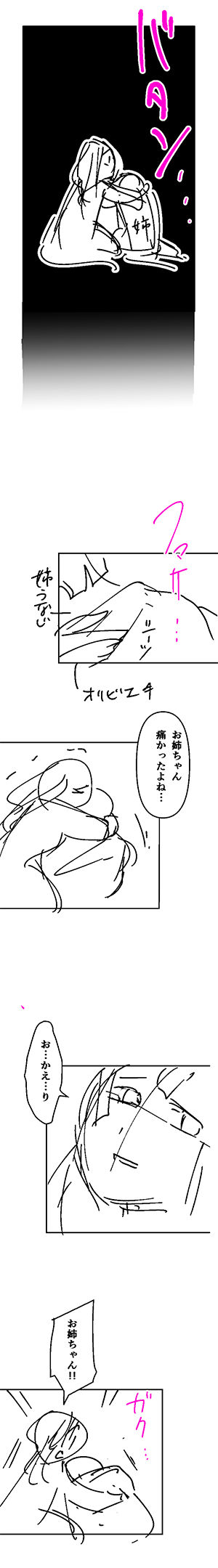 これは今後の作品でも気をつけていきたいところなんですが、1人で作品を創る時のネームはただの棒人間で、顔の大きさや等身も適当なんです。でも『薬師オリヴィエ~』を連載するうち、次の担当の方にお渡しするとなると、今までのやり方では画面に対してのキャラクターの大きさがわかりづらいかも、と思い始めたんですね。なので、次回以降はキャラクターの等身に合わせて、よりわかりやすいネームに改善していこうと考えています。